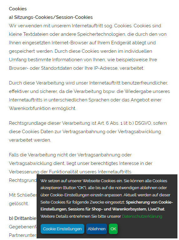 inklusive 3-Button-Lösung: Cookie Einstellungen, Ablehnen, OK - 1x Consent Banner groß (zwecks Einzelauswahl)